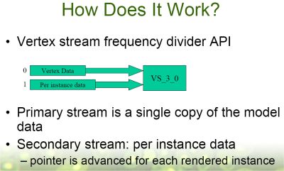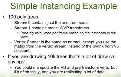 Die 3D-Daten des Baumes werden einmal, die wesentlich kleineren Transformationsmatrizen 100 mal zum Vertex Shader gesendet - dies alles mit nur einem einzigen API-Aufruf, statt der üblichen 100, welche zusätzlich auch noch mehr Daten zur Grafikkarte transportieren müssten.