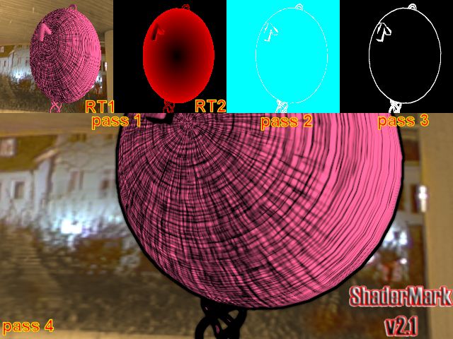 hier wird z.B. im "pass 1" gleichzeitig in das Render Target 1 und 2 geschrieben, welche später in "pass 2", "pass 3" und "pass 4" verwendet werden