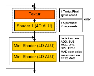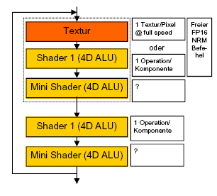 deutlicher Vorteil für den NV40 gegenüber dem NV35, selbst mit Texturbefehlen steht die Arithmetikleistung der NV35-Pipeline zur Verfügung, ohne fast die doppelte und immer kann ein nrm_pp ausgeführt werden