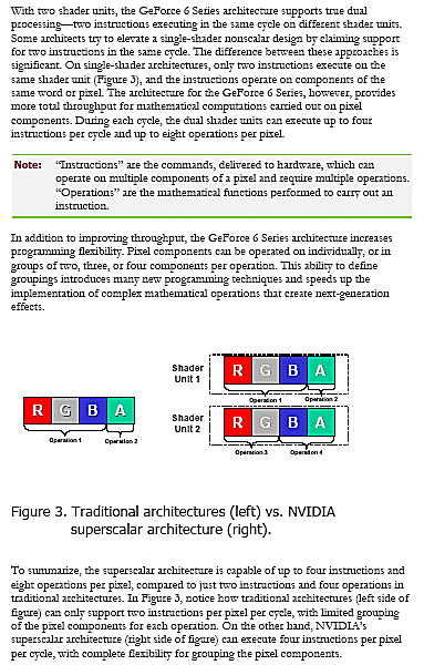 Zusätzlich scheint die Anordnung der einzelnen Komponenten bzw. deren Gruppierung keinen Einfluss mehr auf die Effizienz der Pixel Shader zu haben. Beim R350 sollte noch darauf geachtet werden, möglichst 3D und 1D Operationen zu paaren, um diese per "Co-Issue" (Zusammenfassung) in einem Taktzyklus ausführen zu können. Somit kann der NV40 im besten Falle bis zu 4 Intruktionen pro Takt Pro Pipeline Ausführen.